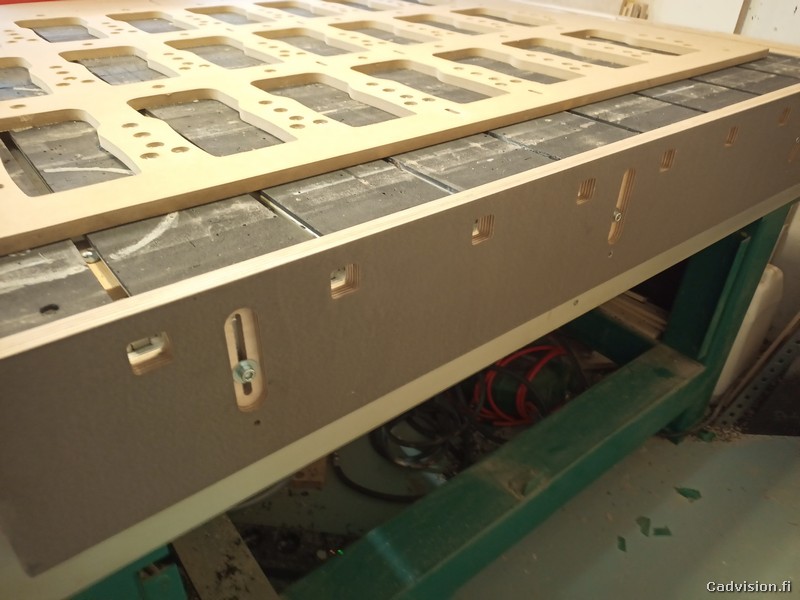Mallinsin klaffipöydän ensin Solidworksilla ja siitä sitten ulos DXF-kuvat ja niistä Estlcam-ohjelmassa työstöradat. Siitä jatkoin viemällä työstöradat WinPC-NC:lle ja cnc-jyrsillä sitten klaffipöydän osien jyrsintä. Jos haluat oppia CAD–>CAM–>CNC -asioista niin ota yhteyttä. Cadvisionilta löytyy kurssit niin harrastajille kuin mekaniikkasuunnitteluinsinööreille.