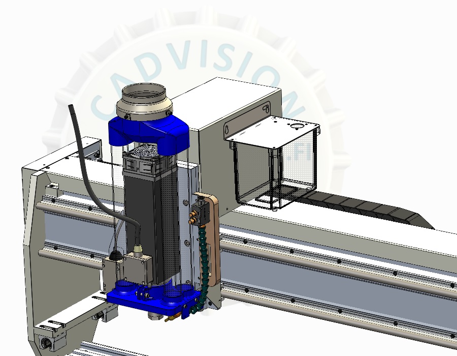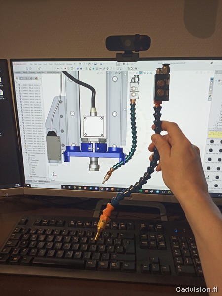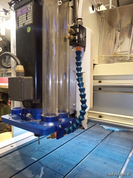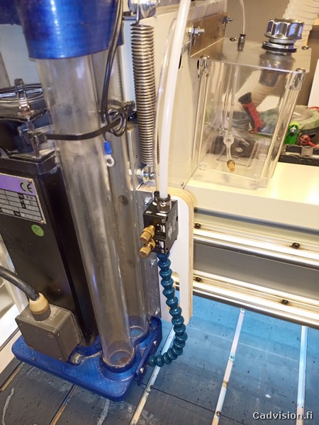 Olin tilannut jo aiemmin suuttimen, letkut ja säiliön ja nyt asensin ensin ilmaputken cnc-koneen energiasiirtoketjujen kautta Z-yksikölle. Suoritin alustavaa hahmottelua mihin kohtaan suuttimen ja säiliön voisi kiinnittää ja seuraavaksi sitten koneelle CAD-malliin tarkastelemaan ja suunnittelemaan tarkemmin kiinnitykset…