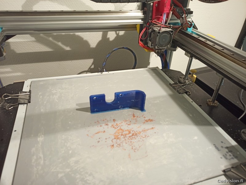 Eli Solidworksissa tallennetaan vanha suoja uudella numerolla ja nimellä ja uuteen osaan lisättiin kolo. Siitä tiedostovienti STL-muodossa ja STL-tiedosto avataan tulostimen viipalointi- eli slicer-ohjelmassa. Siitä G-koodi tulostimelle ja tulostus voi alkaa…