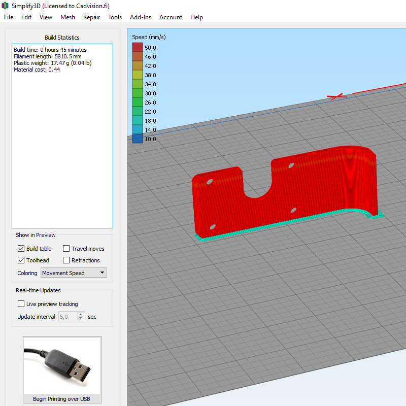 Adapterin 3D-malli tallennettu STL-muotoon ja tuotu Simplify 3D -slicer-ohjelmaan. Slicer tekee G-koodin joka sitten ajetaan 3D-tulostimella…