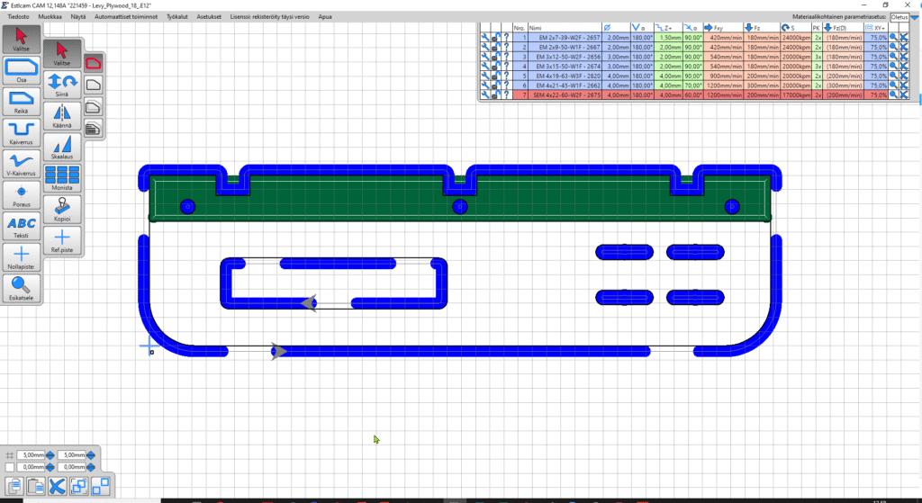 Sumuttimen kiinnityslevyn työstöratojen teko Estlcamissa. Vihreänä näkyvä alue ohennetaan niin, että se mahtuu U-profiilin väliin. Siniset alueet koneistataan kokonaan läpi. Katkot ovat kiinnipitokielekkeitä (noin 2 mm korkeita), joiden avulla palikka pysyy kiinni koneistuksen loppuun asti. Tästä saadaan G-koodi CNC-jyrsille.