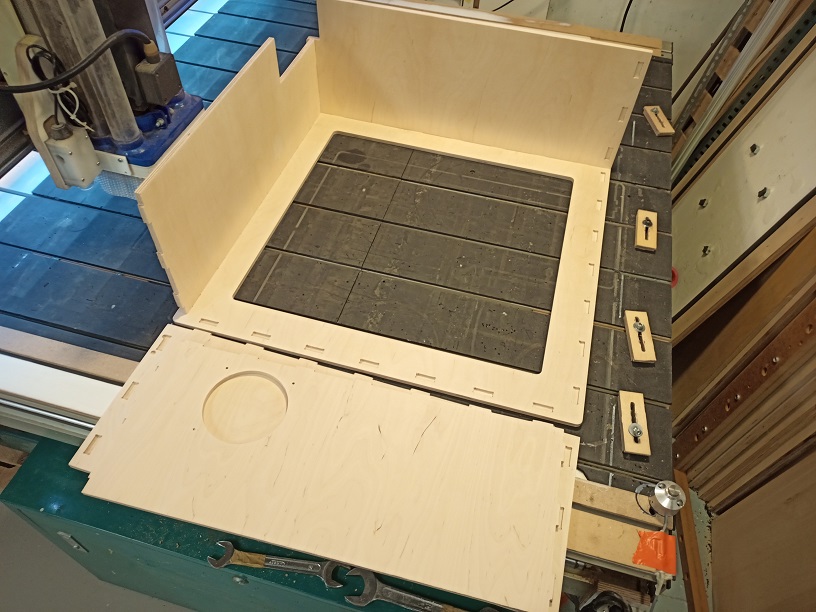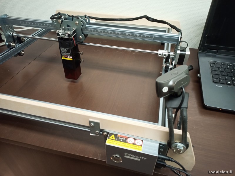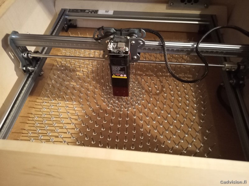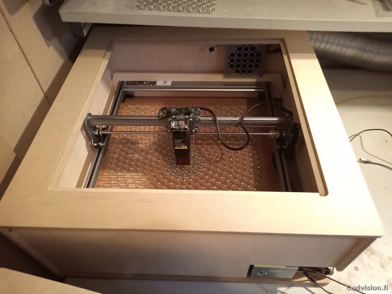 Creality Falcon 10W Laser Engraver 400 x 415 mm DIY protective casing: First quick design using Solidworks 3D CAD Making of the laser safety cover casing… Safety enclosure for Creality Falcon Laser engraver Darth without the helmet…. First tests… …first test cut DIY pin bed for the laser Fume extraction DIY casing. The lid is removable.