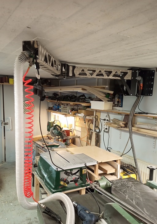 Norsu 2400 AL is a versatile and practical solution for garages, workshops, and workspaces where organization and functionality are valued — or, as my own case proves, it also works perfectly without any real organization. The robust boom structure helps keep hoses, cables, and tools off the floor, making the workspace cleaner and safer.